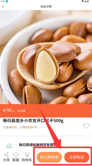 选定商品进入详情页面后,可点击加入购物车或立即购买按钮来完成下单流程。