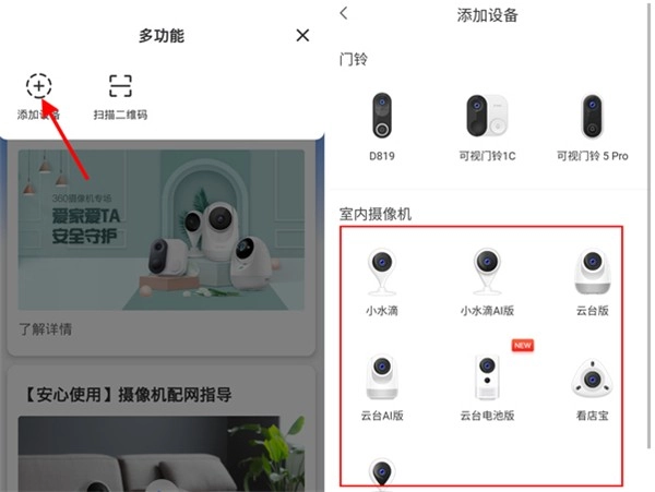 登录360摄像机后,点击界面右上角的【+】按钮,接着选择“添加设备”选项,再根据提示挑选对应的摄像头类型,即可启动设备添加流程。
