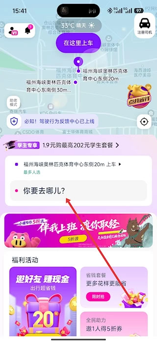 打开出行服务应用,进入首页后找到目的地输入框,点击该输入框来规划行程路线。