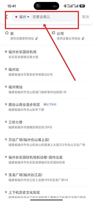 页面跳转至地址选择界面后,在目的地查询框中填写或点选具体位置,以此确定本次出行的终点。