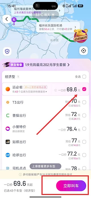 选定目的地后,系统会呈现多种乘车选项及对应的费用信息,你可以从中挑选合适的车型,比如经济类里的优惠方案,确认无误后点击呼叫车辆即可。
