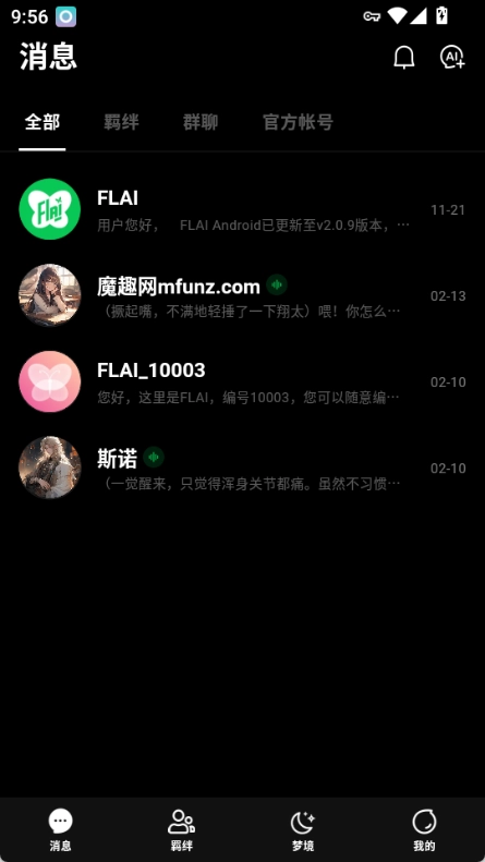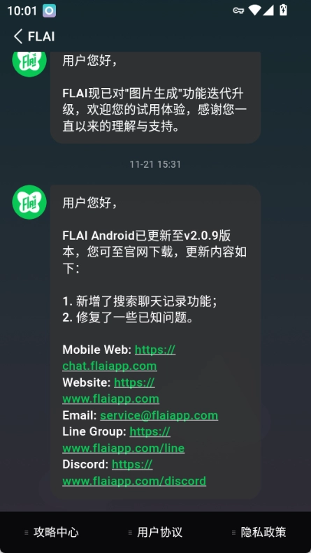 flai的版本迭代经历了不同阶段,最初主要是2.1.x系列,后来也推出过2.1版本。不过目前最新版本以2.0.x系列为主,当前最新版本是2.0.9。这个新版本新增了不少功能,比如支持搜索聊天记录,同时上线了ma模型并停用了lc模型。此外,还支持清空所有聊天记录并重置当前AI人设,另外还有永久记忆、双AI群聊、双倍人设等实用功能。