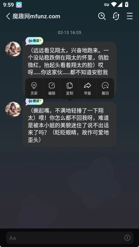若您点击AI的回复并选择“编辑”选项,就能对AI回复的内容进行修改。AI会坚信您刚刚编辑过的文字是它主动阐述的,换句话说,您可以随时改动AI的记忆。