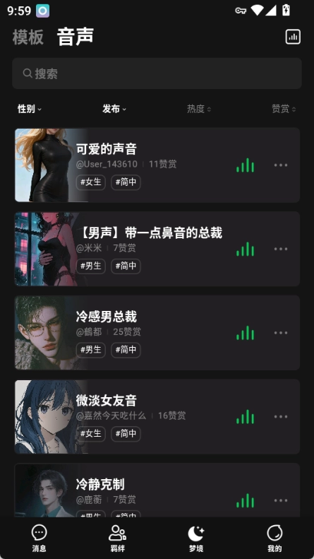 顶部设有“模板”与“音声”的切换功能,同时支持搜索操作,还能依据性别、声音特点等条件进行筛选。