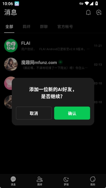 刚进入FLAI时,会看到三位默认的AI好友,分别是男生、女生以及资料空白的Robot,你可以挑选自己感兴趣的一位开启聊天。