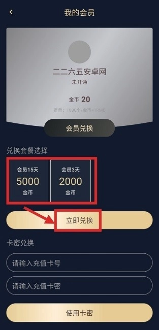 进入会员专区,根据需要选择套餐后点击“立即兑换”