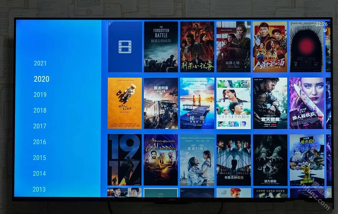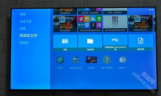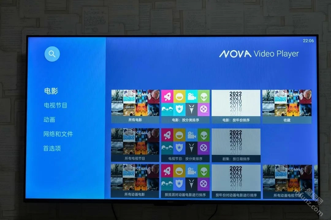 打开 Nova Video Player 后,首页界面给人的感觉十分舒服,相比 KODI 要美观不少,设计风格更贴近当下流行趋势。主要功能菜单集中在左侧区域,自上而下依次排列着电影、电视节目、动画、网络和文件、首选项这几个选项。而界面右侧则展示着以缩略图形式呈现的海报墙。