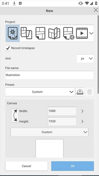 打开ClipStudioPaint手机版,然后创建一个新的文件。