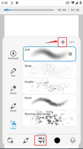 进入新档案后,点击画笔功能,再点击笔刷上的“+”图标。