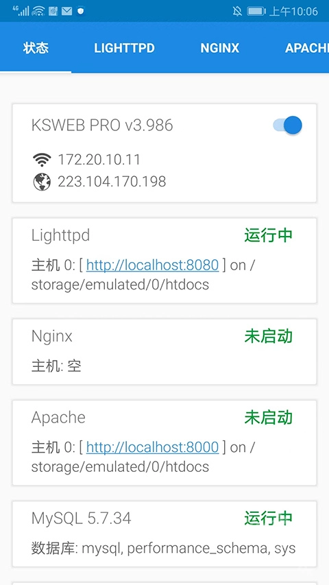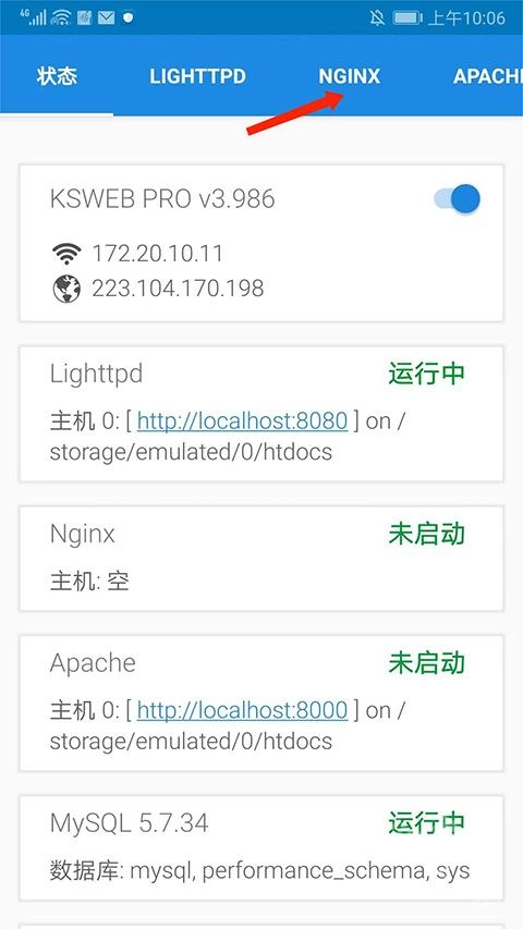 打开KSWEB应用,进入其主界面后,能看到状态、LIGHTTPD、NGINX、APACHE、MYSQL、PHP、FTP等多个分栏,用户可依据自身需求选择使用,接下来我们以【NGINX】为例进行说明。
