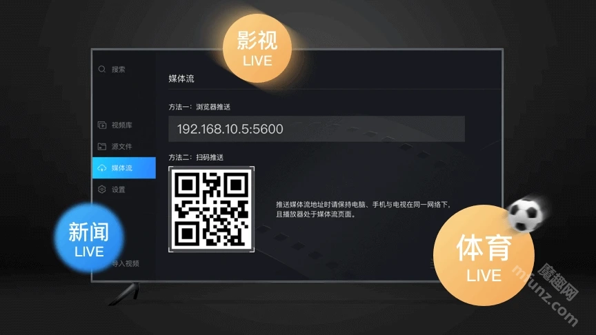多种导入方式:支持U盘、移动硬盘等外接设备导入,也支持无线局域网导入,只需将电视与其他设备连接至同一局域网,就能访问并播放电脑、NAS等设备中的内容。