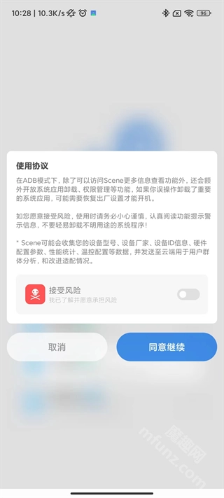 在魔趣网完成Scene工具箱软件的安装并启动后,找到界面上的“ADB模式”选项并点击,待弹出风险提示窗口时选择同意,随后即可进入Scene的主界面,查看各类软硬件相关信息。