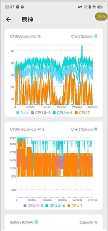 找到《原神》对应的任务,点击后即可查看丰富的监控信息,涵盖MAX最大帧率、MIN最小帧率、AVG FPS平均帧率、VARIANCE帧速率差、245FPS流畅度、>46℃烫手警告、MAX最高温度与AVG平均温度,另外还有更直观的帧率曲线、CPU占用率曲线等内容。