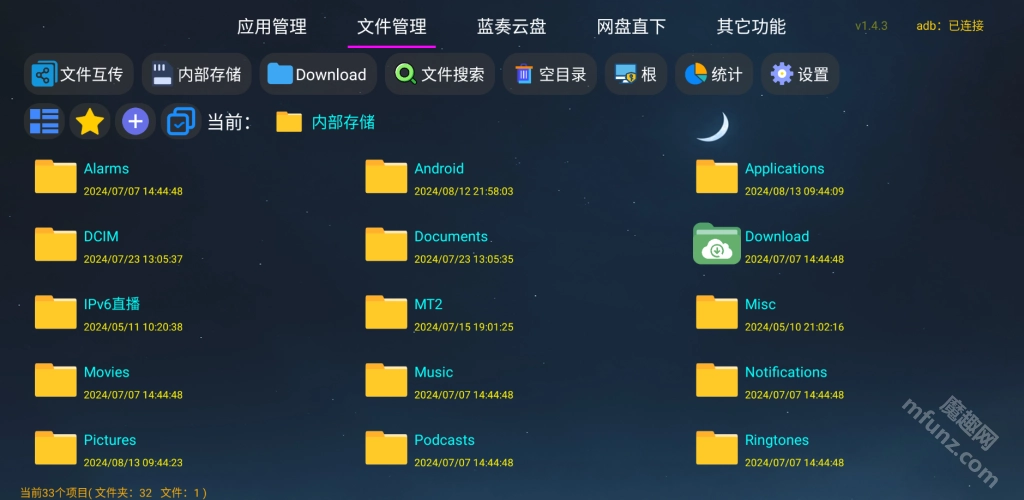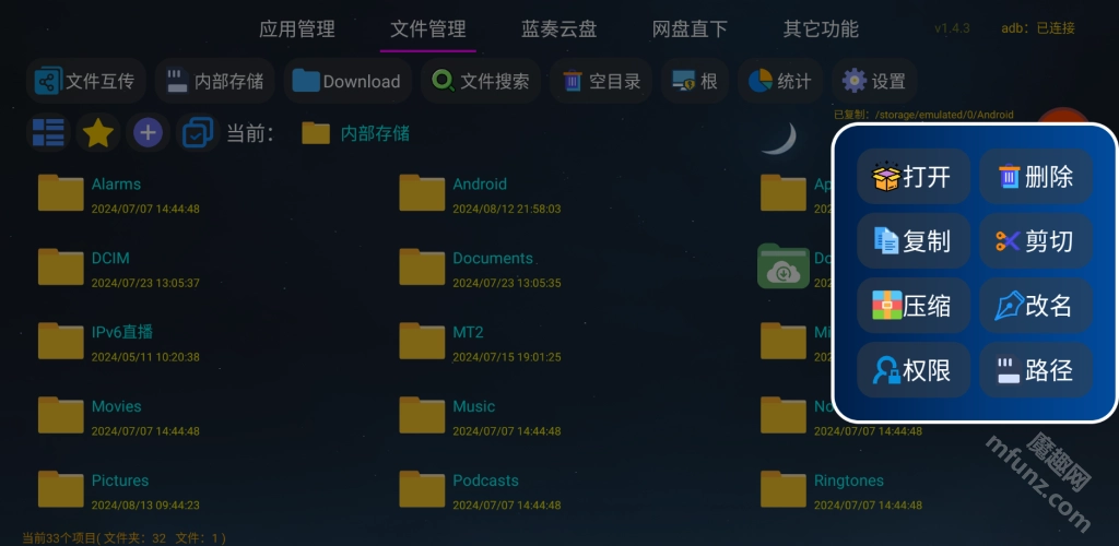 可以对根目录、TF卡以及U盘内的文件进行管理,像复制、剪切、解压文件等操作都能实现;如果拥有root权限,还能使用更多功能。