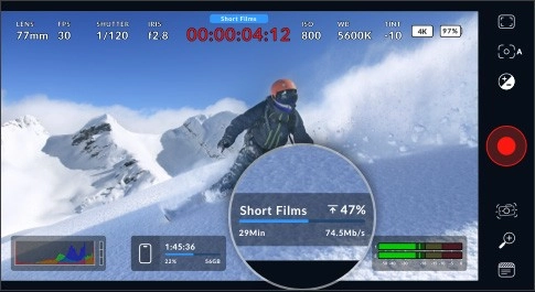 Blackmagic Camera还配备了手动功能,您能够先把素材录制到设备里,之后在具备网络连接的情况下,挑选需要通过Blackmagic Cloud上传的片段。