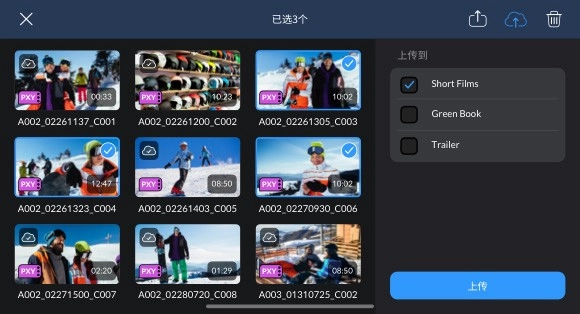 登录Blackmagic Cloud后选择一个DaVinci Resolve项目。无论是每次录制结束,还是在录制进行的过程中,媒体文件都会自动上传并同步给项目的所有成员。