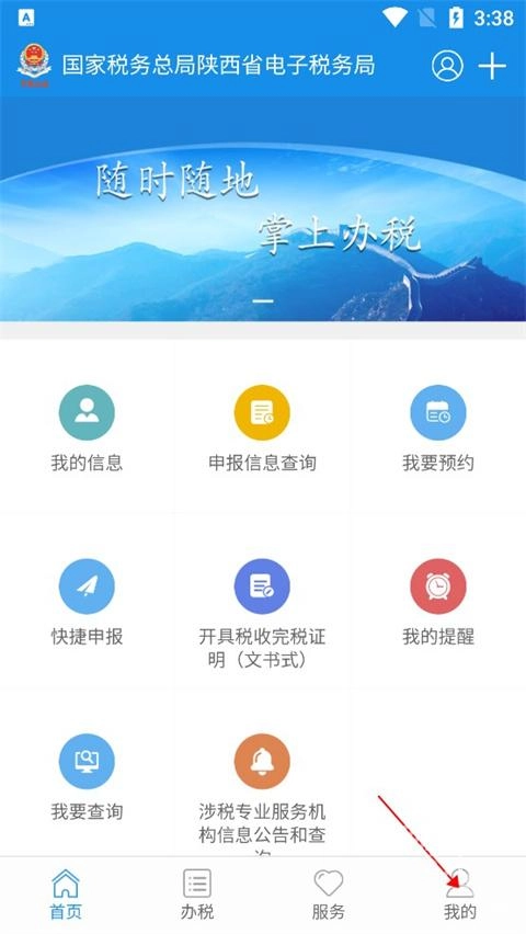 您当前浏览的界面为陕西税务手机应用程序,点击右下角的“我的”选项,即可进入登录页面。
