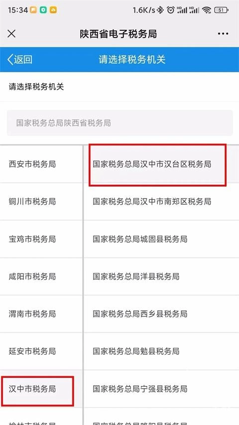 然后点击下方取票大厅右侧的菜单,待弹出界面后,在左侧选择“汉中市税务局”,右侧选择“国家税务总局汉中市汉台区税务局”。