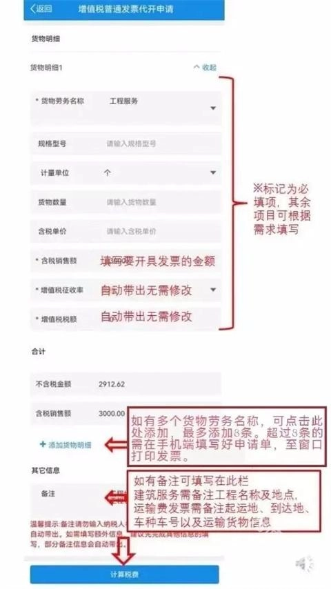 货物明细填写完毕后,请在页面最下方的“备注”栏中填写您需要备注的相关内容。备注完成后,点击页面最下方的“计算税费”按钮即可。
