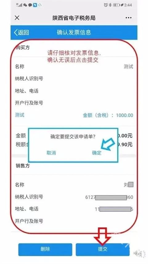 请再次核对发票信息,确认信息准确无误后,点击页面最下方的“提交”按钮,待弹出确认窗口时,点击“确定”即可。