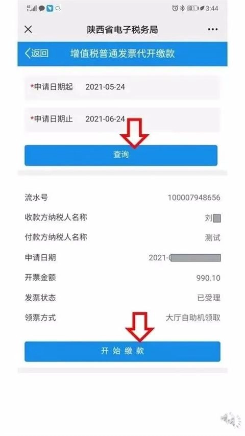 弹出增值税普通发票代开缴款界面后,点击“查询”按钮,在下方出现的列表里找到刚刚提交的申请单,接着点击“开始缴款”按钮即可。