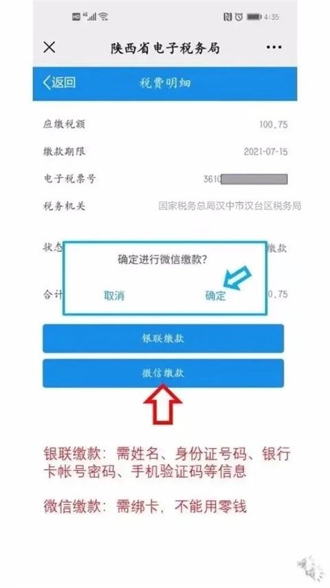 您可以选择银联缴款或者微信缴款,银联缴款需要准备好付款银行卡的卡号、密码以及手机验证码这三项信息,微信缴款则要提前绑定银行卡才能支付,暂不支持微信零钱支付。接下来为您演示微信支付的流程,请您先点击“微信缴款”,待弹出窗口后点击“确定”即可。