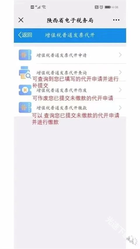 ②回到增值税普通发票代开主界面后,第二项“增值税普通发票代开查询”功能可用于查询您在特定时间段内开具的发票信息,还能对已填写但尚未提交的代开申请进行补提交操作;第三项“增值税普通发票代开作废”功能,能够作废您已提交但未完成缴款的代开申请;第四项“增值税普通发票代开缴款”功能,则可以查询您已提交且未缴款的代开申请,并在此进行缴款操作。