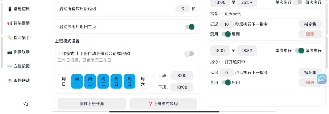 调整:开机任务,上班模式可以执行百度上下班,常用应用设置为百度地图即可,如果是悬浮百度选择的是百度地图,则最后会以悬浮方式显示
