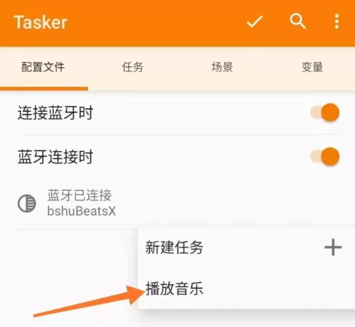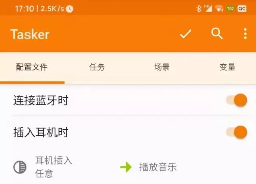 点击加号按钮,接着创建一个触发事件,选择“插入耳机时”这个选项;然后在硬件分类里找到“耳机插入”并完成设置;最后选中刚才创建好的“播放音乐”任务就可以了。