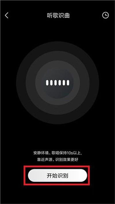 接下来将进入听歌识曲功能,点击【开始识别】按钮,您可以选择播放歌曲,也可以自己哼唱或演唱来进行识别。