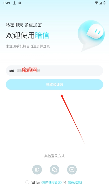 首先在魔趣网下载暗信并进行安装,之后点击“同意并继续”来启动软件。
