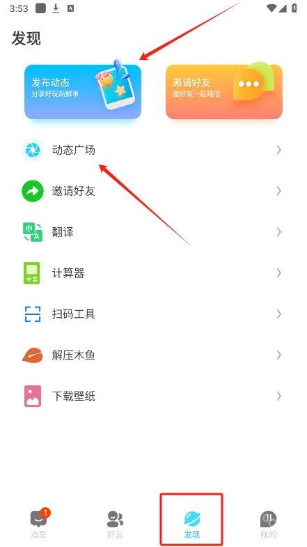 在“发现”页面点击“动态广场”,就能浏览你所有好友发布的动态;要是你也想分享动态,只需点击“发布动态”进入编辑界面,完成编辑后发布即可。