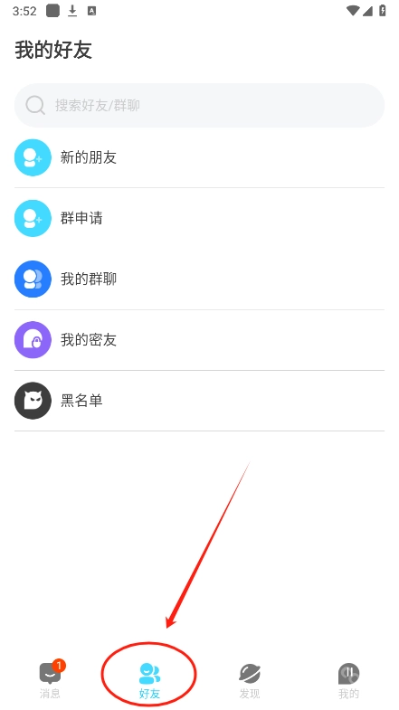 在“好友”栏目里,你能看到自己所有的好友、群聊、密友,还有黑名单。