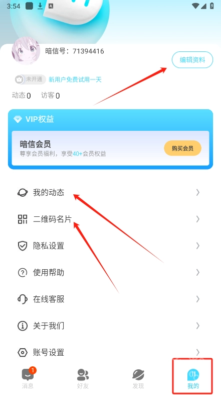 在“我的”页面里,你可以对头像、签名等个人资料进行编辑。同时,这里还能查看你发布过的所有动态,也能打开专属的二维码名片,他人只需扫描这张名片,就能直接添加你为好友。