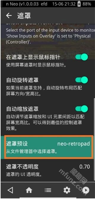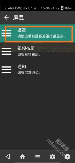 手机运行RetroArch安卓版,启动一款游戏后打开菜单,选择齿轮图标,找到“屏显”选项并点击。