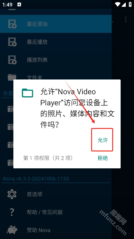 首先在魔趣网下载并安装nova播放器apk,然后点击“允许”授予访问权限,即可进入软件首页。