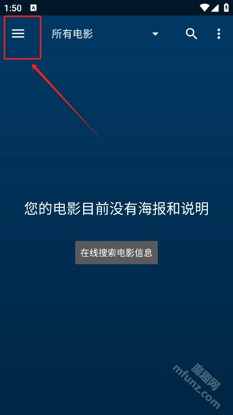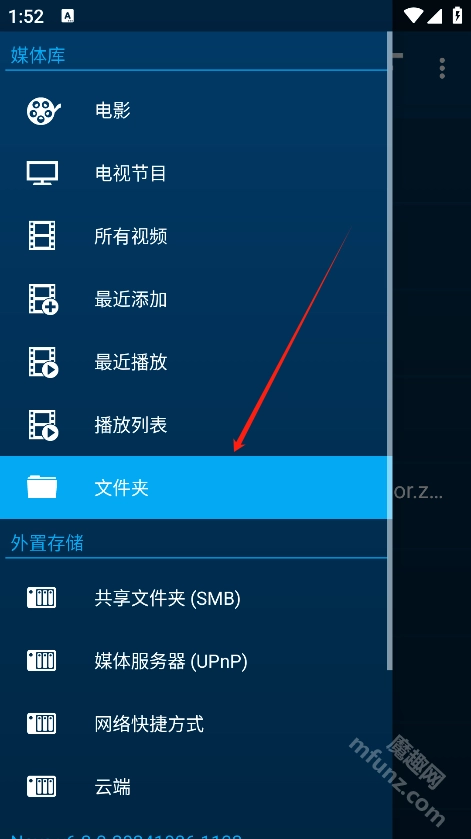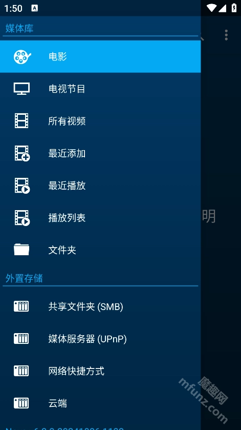 进入首页后,点击左上角的“三横线”图标,在弹出的菜单中可以选择电影、电视、最新添加、云端等多种功能选项。