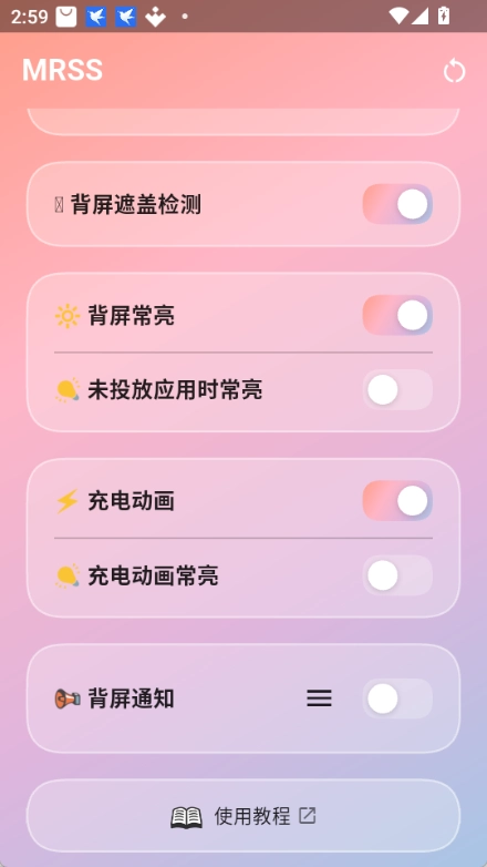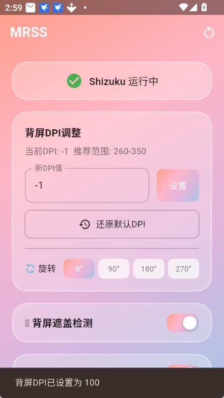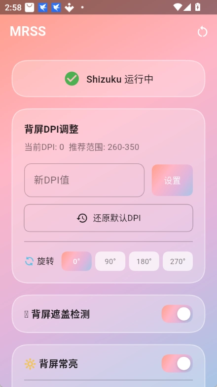 小米MRSS也叫mrss小米背屏切换器,是专门为小米/Redmi背屏机型开发的第三方通知增强工具,一般和Shizuku服务配合使用,具备背屏DPI调整、背屏遮盖检测、背屏常亮、充电动画等功能,此外还支持0-270度旋转以及暗夜模式,若需要还原可设置自动销毁时间。
