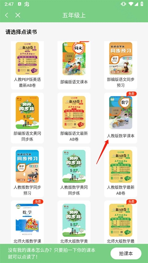 打开爱点读应用,进入选书功能页面,找到正在学习的数学课本,然后将其添加到首页。