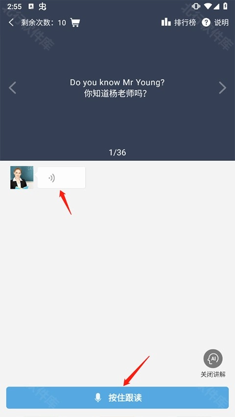 进入后先点击语音播放完整听一遍,接着点击下方的跟读按钮进行朗读练习。