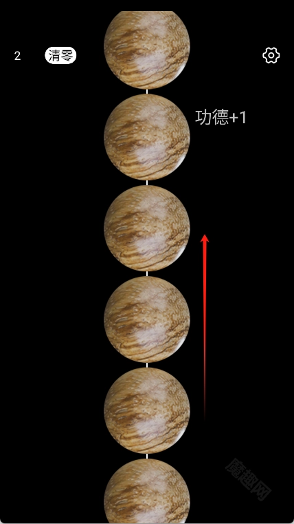 进入首页后,只需用手指向上或向下滑动,就能拨动佛珠;每滑动一次,屏幕上就会显示“功德+1”。
