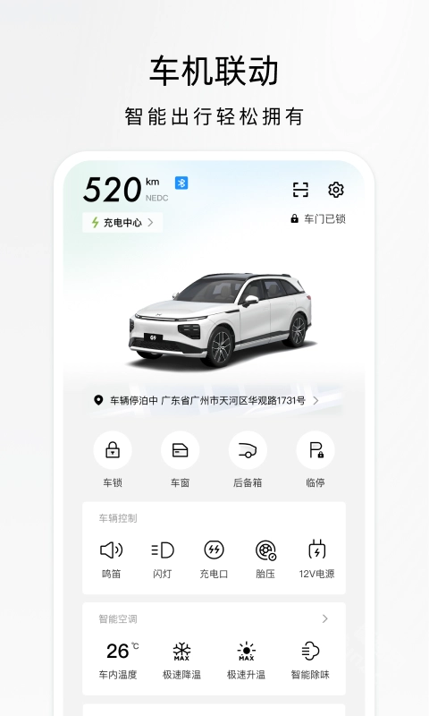 小鹏汽车支持用户借助手机对车辆的各项功能进行远程操控。用户还能够实时掌握车辆的状态信息,例如里程数、燃油剩余量或者电池电量情况等。