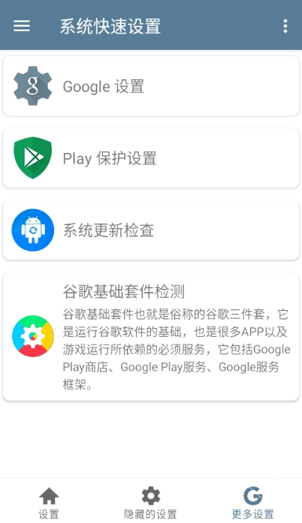 谷歌套件检测功能:可自动检测手机是否完整安装谷歌服务框架(GMS),并显示其兼容性情况。