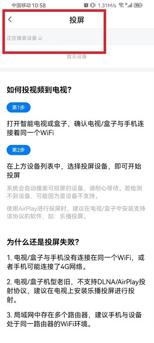在上方设备列表中,选择投屏设备,开始搜索