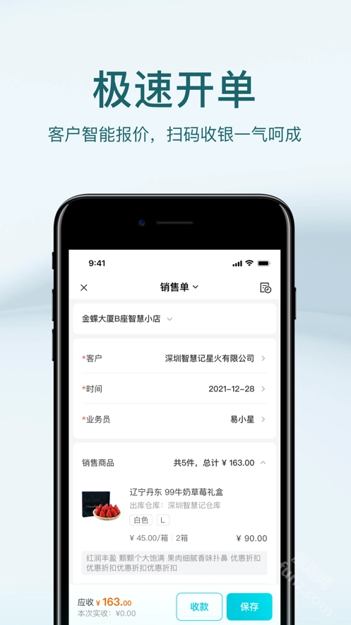 2、销售开单与支付收银:具备扫码开单、智能报价、收银等功能,助力销售流程简化。
