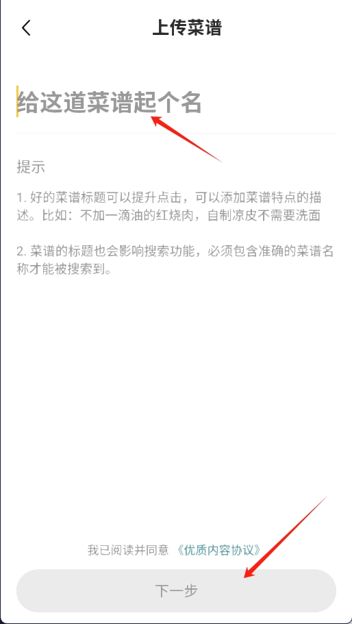 在指定的文本框中填写主界菜谱的标题,接着点击“下一步”按钮。