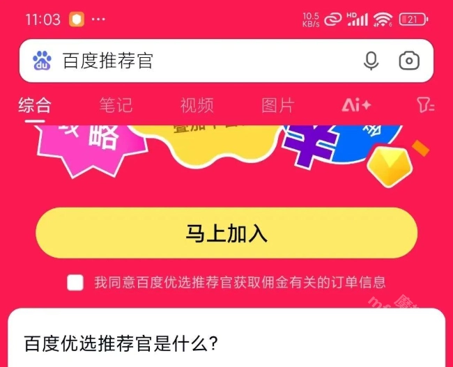 打开百度App,在搜索栏输入“百度推荐官”,点击搜索结果里的“马上加入”按钮,就能进入百度推荐官活动页面。