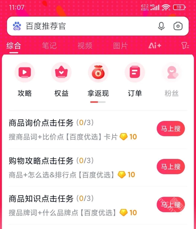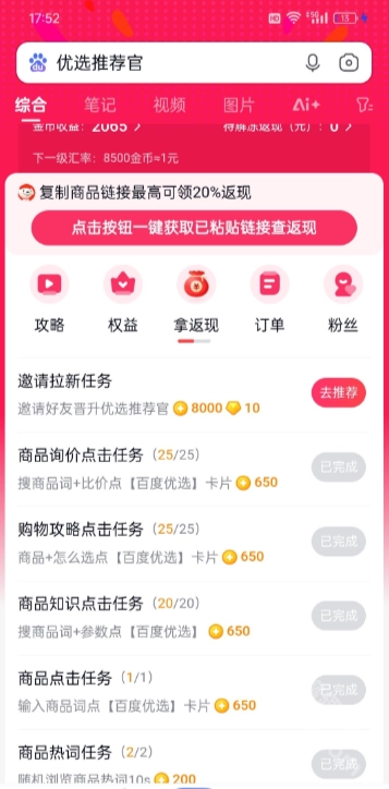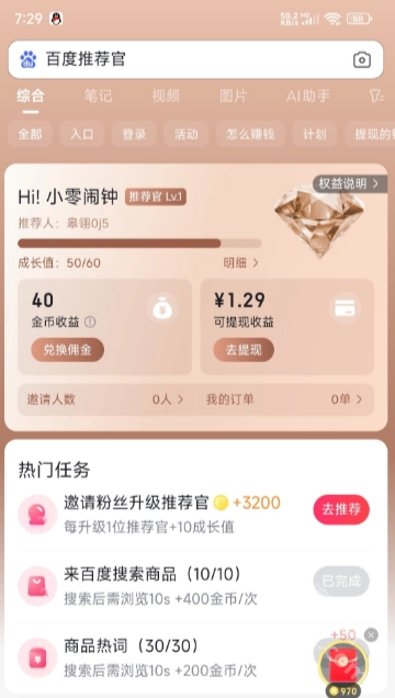 完成5次搜索任务后,系统会自动将您升级为正式的百度推荐官,解锁更多任务和奖励。