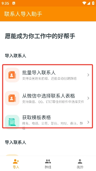 你可以选择批量导入联系人,也可以从微信中选择联系人表格,或者获取模板表格。