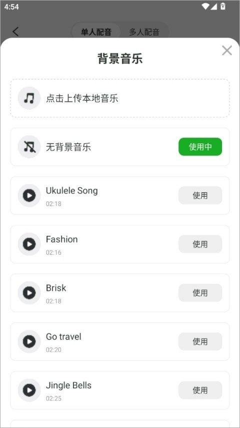 点击“背景音乐”选项后,能够导入本地音乐,也可以使用音效库。